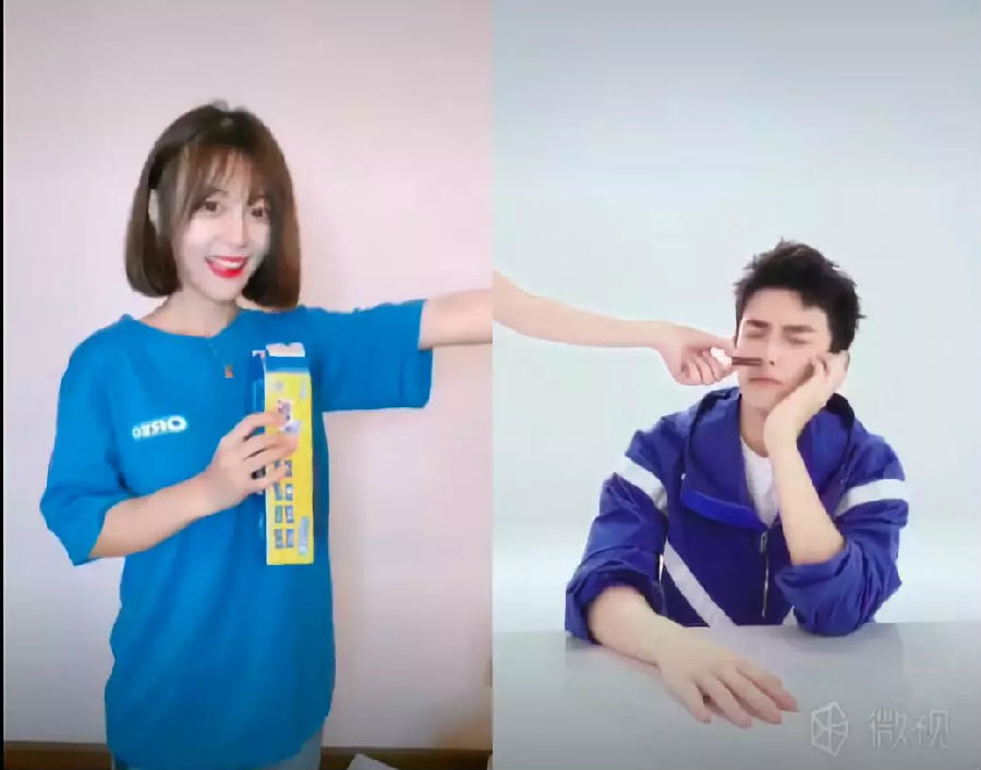 最近大热的奥利奥花式合拍挑战「新口味 等你造」活动中,就是使用了「与TA合拍」功能,通过加入了分屏视频的玩法——一个屏幕中同时出现多个画面,这样一来,追星女孩就可以通过同框与国民初恋吴磊弟弟分享一块奥利奥饼干,与爱豆同框进行甜蜜互动,活动一经推出,短时间内触发近千万曝光。