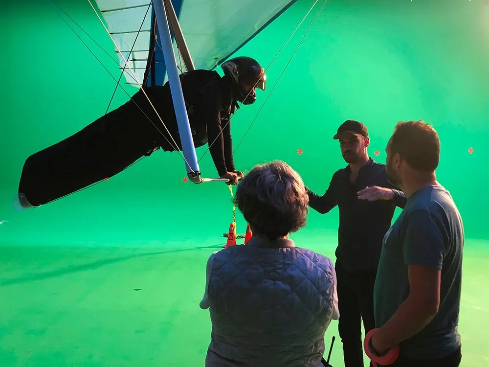 像这一幕天空中的“滑翔伞”,在拍摄过程中其实是身处绿色影棚。