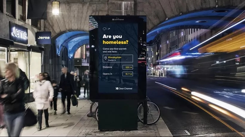 近期,美国大众媒体公司清晰频道(Clear Channel)与斯德哥尔摩市展开了一项合作——将它的广告牌用于帮助无家可归者寻找并前往距离最近的庇护所。在活动中,清晰频道公司对其在该市的 53 块广告牌进行了编程,从而使其可以根据城市气温交替。