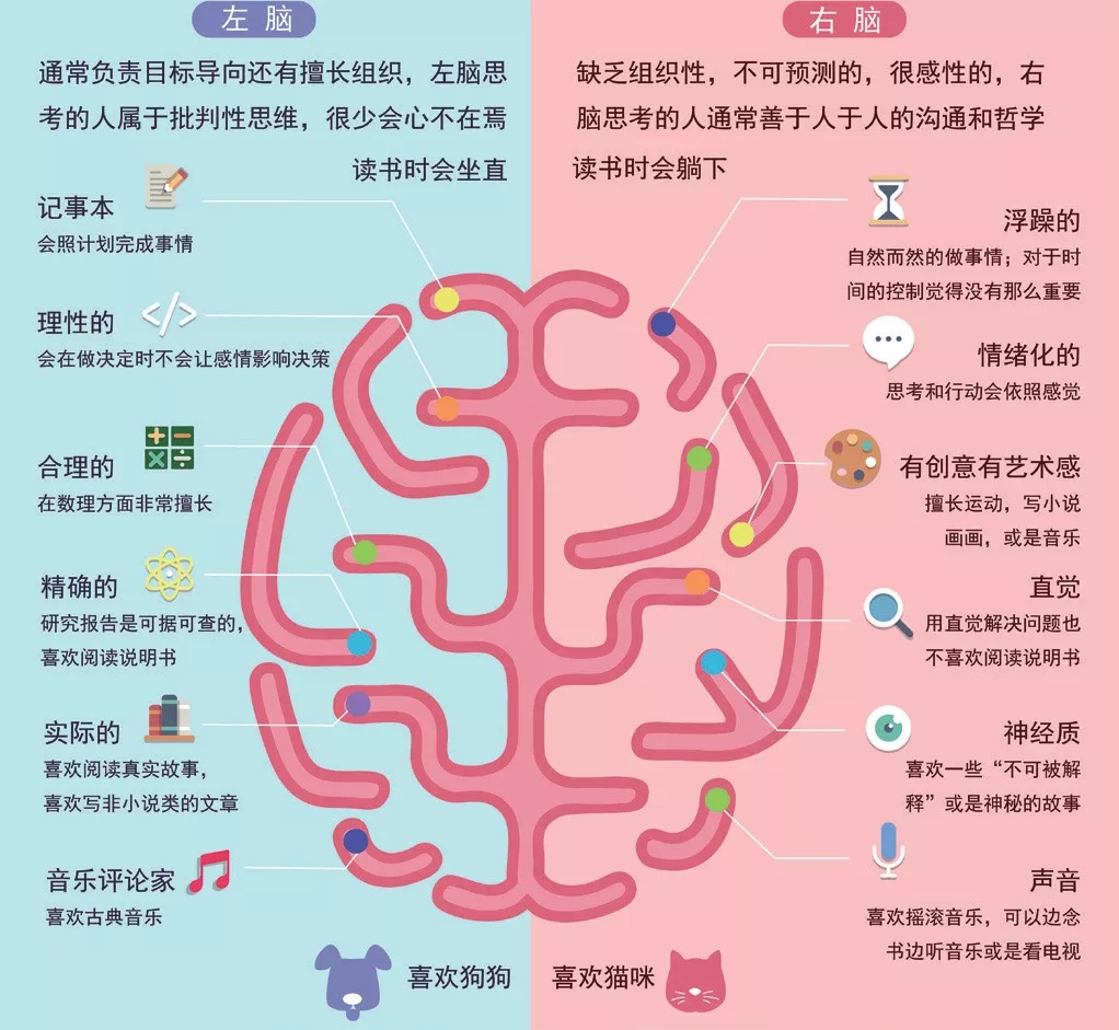 ● 左脑,被称为“理性脑”,主要处理文字和数据等抽象信息,具有理解、分析、判断等抽象思维功能,有理性和逻辑性的特点;