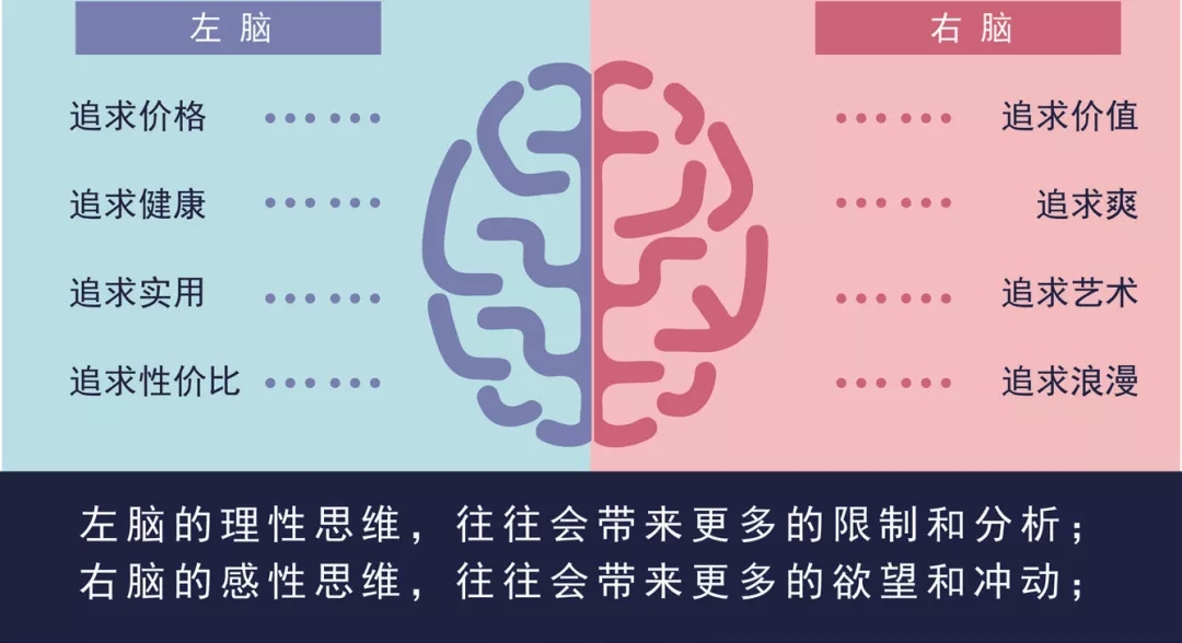 左脑追求价格;右脑追求价值;左脑追求健康;右脑追求爽;左脑追求实用;右脑追求艺术;左脑追求性价比;右脑追求浪漫;左脑的理性思维,往往会带来更多的限制和分析;右脑的感性思维,往往会带来更多的欲望和冲动。