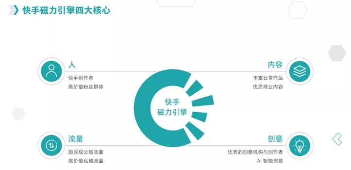 快手的“磁力引擎”,其目标是让所有的商业伙伴在快手生态中共生共赢。“磁力引擎”以人、内容、流量和创意为核心,依托AI驱动全链路、全智能营销投放,可以多维度、全方位洞察老铁兴趣与所需,释放快手商业能力。在“老铁经济”的引力下,与品牌产生强共生关系,从而实现最佳的转化和生态循环。